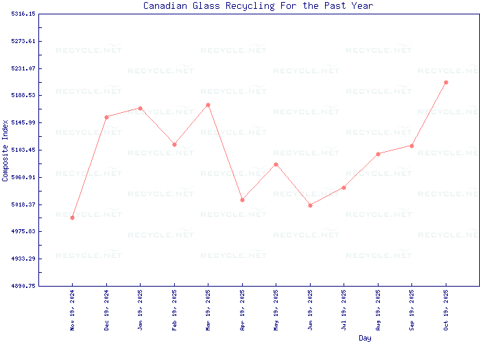 The Canadian Glass Recycling Composite Index tracks the changing market prices of glass scrap in the Canadian marketplace. The Index consists of a weighted basket of specific benchmark grades of scrap glass. The Index includes snapshots of 5 viewpoints of market trends : the past 7 days, past 30 days, past 90 days, past 1 year and past 2 years.